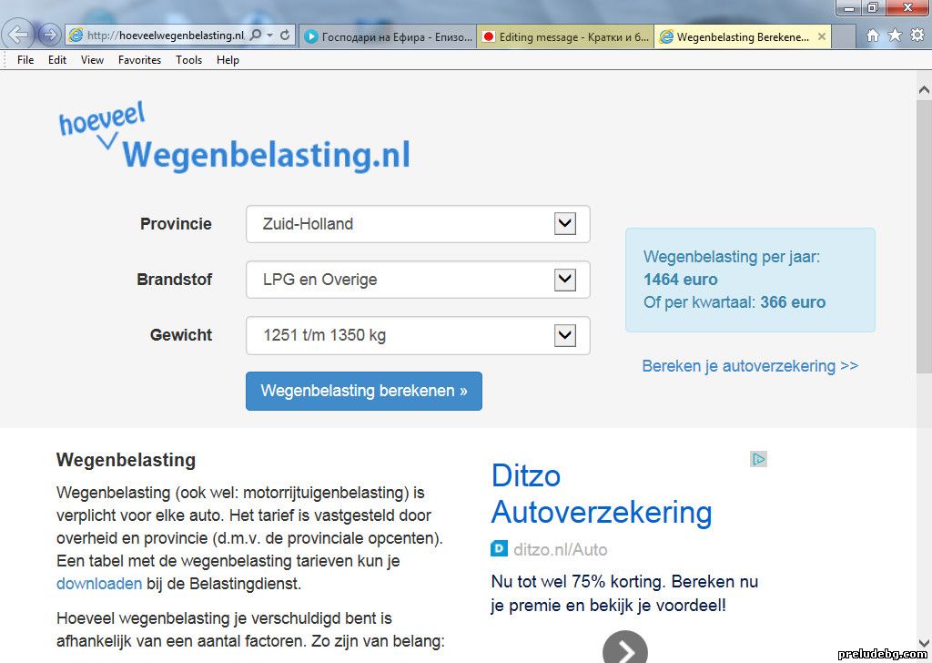 | Quote mom4i74 (  ) дали ще преференции за тия които карат с зелено гориво(пропан бутан и природен газ) както е в европейските дьржави? Момч, не пиши безумици. ей ти пример в южна Холадия кола която тежи 1250 кг. и е на газ и друго зелено гориво . 1308 евро на година или 327 на тримесечие. http://hoeveelwegenbelasting.nl/?pk_cam....lasting Въведи си провинция ,тип на горивото и кила на колата. Аз плащам 178 на тримесечие дет съм на най-евтиното -бензин .Даже сгреших ,щото Прелюда е по тежък от 1250 кила та значи идва